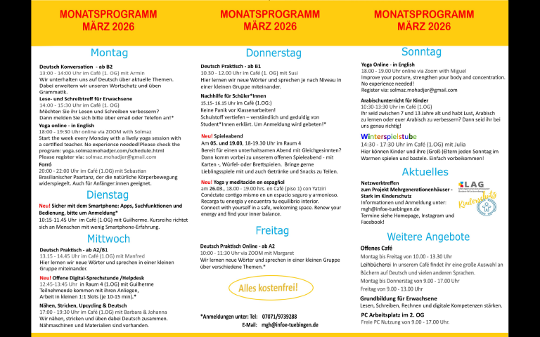 - per Skype mit Mèhèza - Anmelden unter: mgh@infoe-tuebingen.de | Du möchtest dein Deutsch verbessern? Hier lernen wir neue Wörter und sprechen in einer kleinen Gruppe miteinander. |