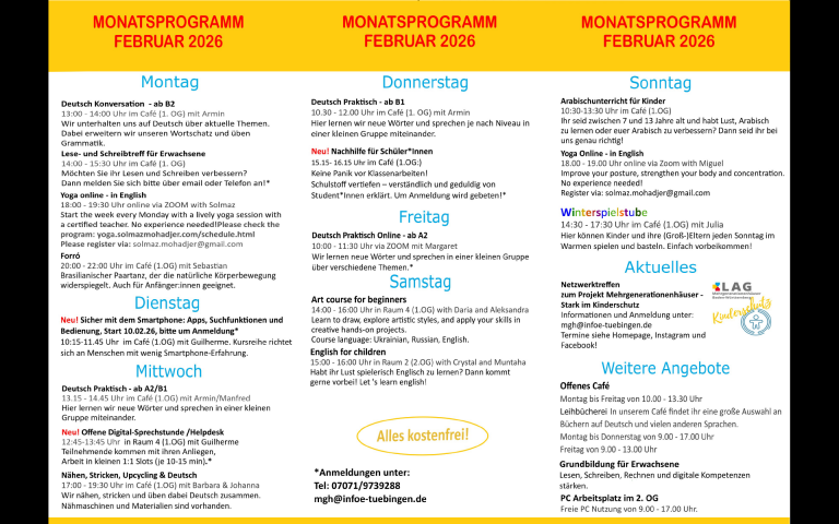 Bei uns kannst du dich ehrenamtlich engagieren oder selbst an unserem offenen Programm teilnehmen. Die Angebote sind kostenfrei und ohne Anmeldung! Die meisten Angebote finden in unserem schönen, großen Café im 1.Stock im InFö statt.